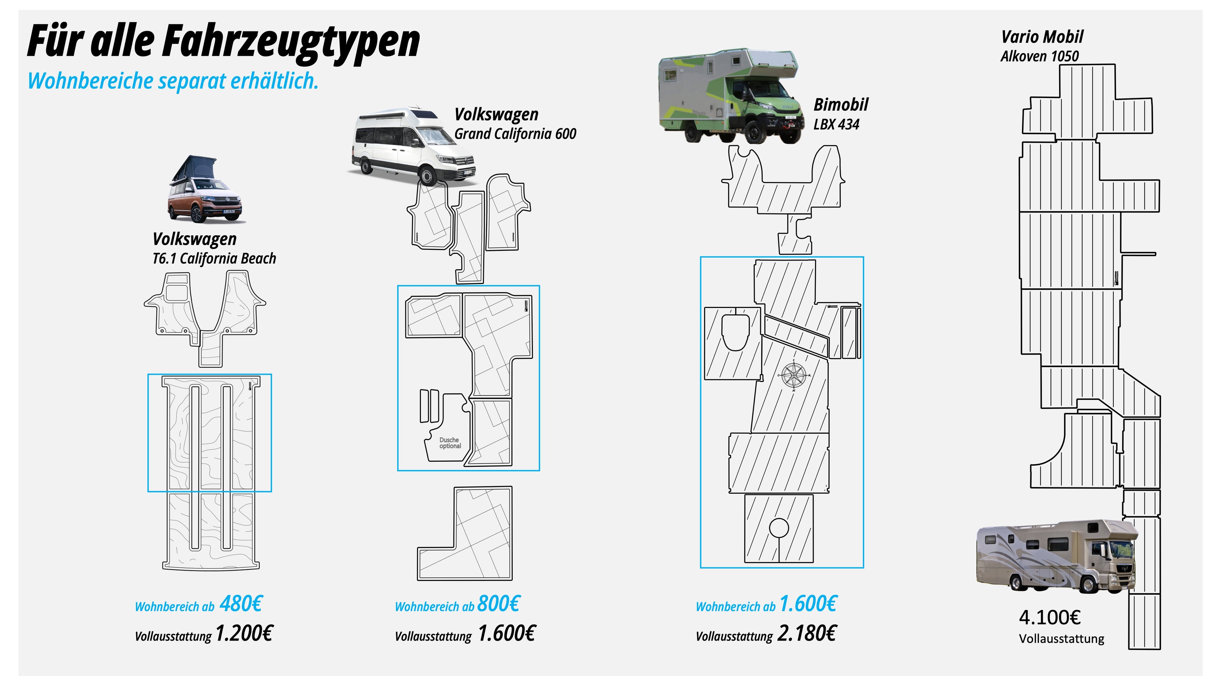 Die premium Lösung von Cloudpad wird fair und transparent nach Quadratmetern abgerechnet. Bitte beachte, dass es hier nicht nur auf die tatsächliche Fläche deines Bodens ankommt, sondern auch der für die Produktion deines Bodens notwendige Verschnitt eingepreist werden muss. Für einen 6m Kastenwagen liegen die Kosten in der Regel bei ca. 900 Euro. Die exakten Kosten werden nach der Vermessung und im Rahmen des offiziellen Angebots kommuniziert.